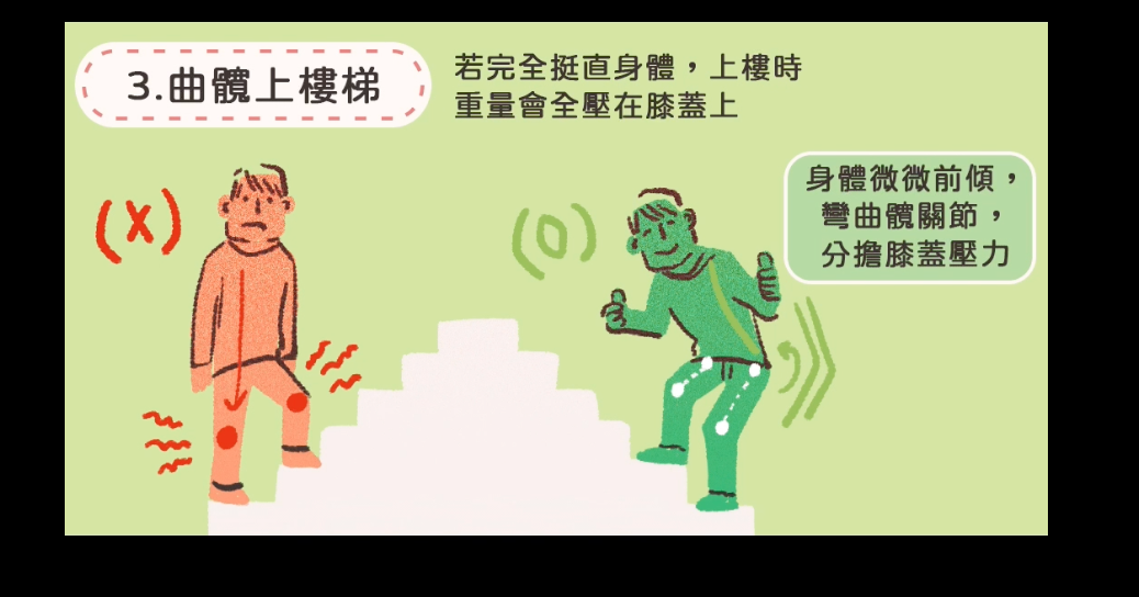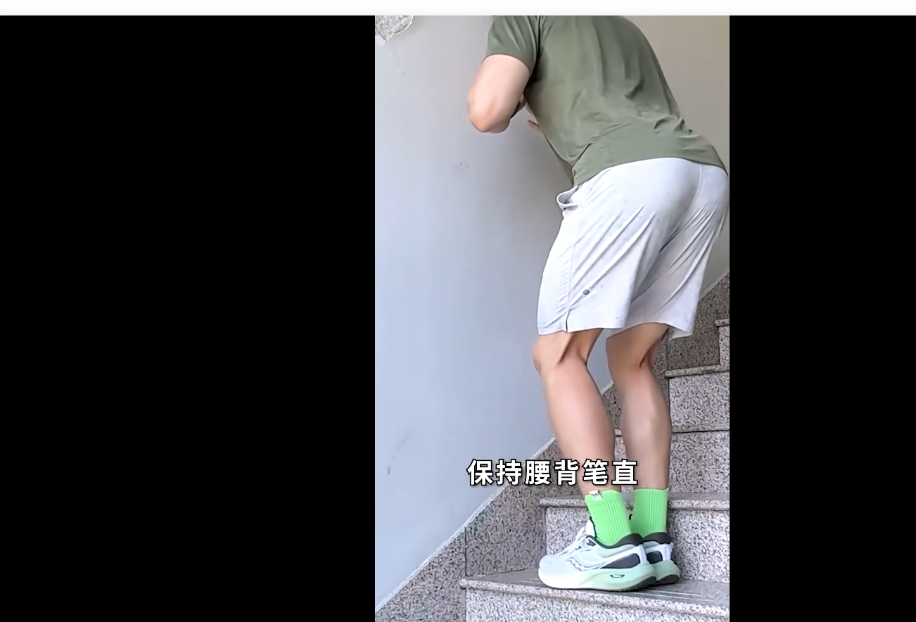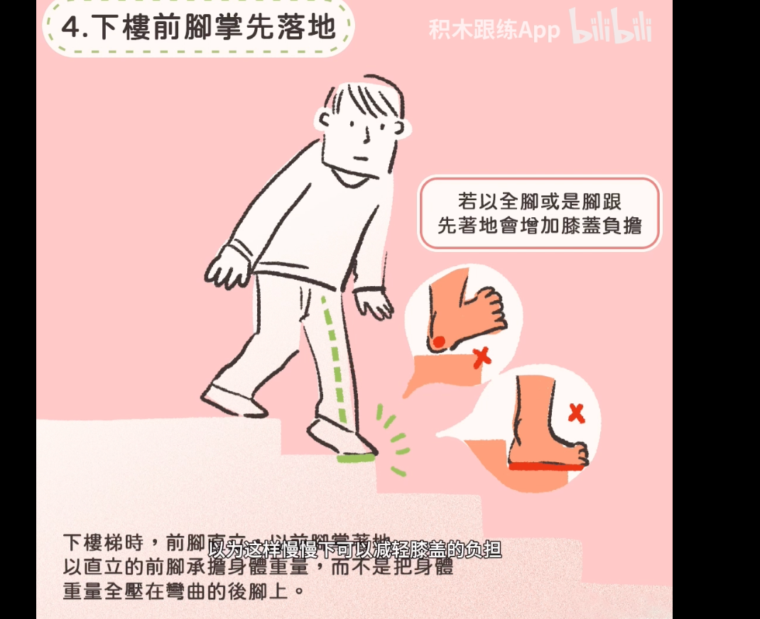 下楼梯: 前脚掌落地后需要发力,而不是将重量都放在后退上 身体前倾